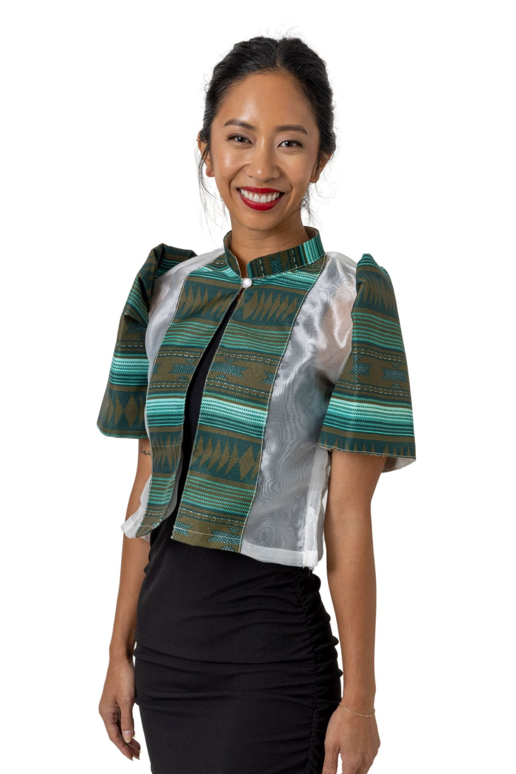 - Design: Half-jacket with Chinese collar and Filipiniana butterfly sleeves